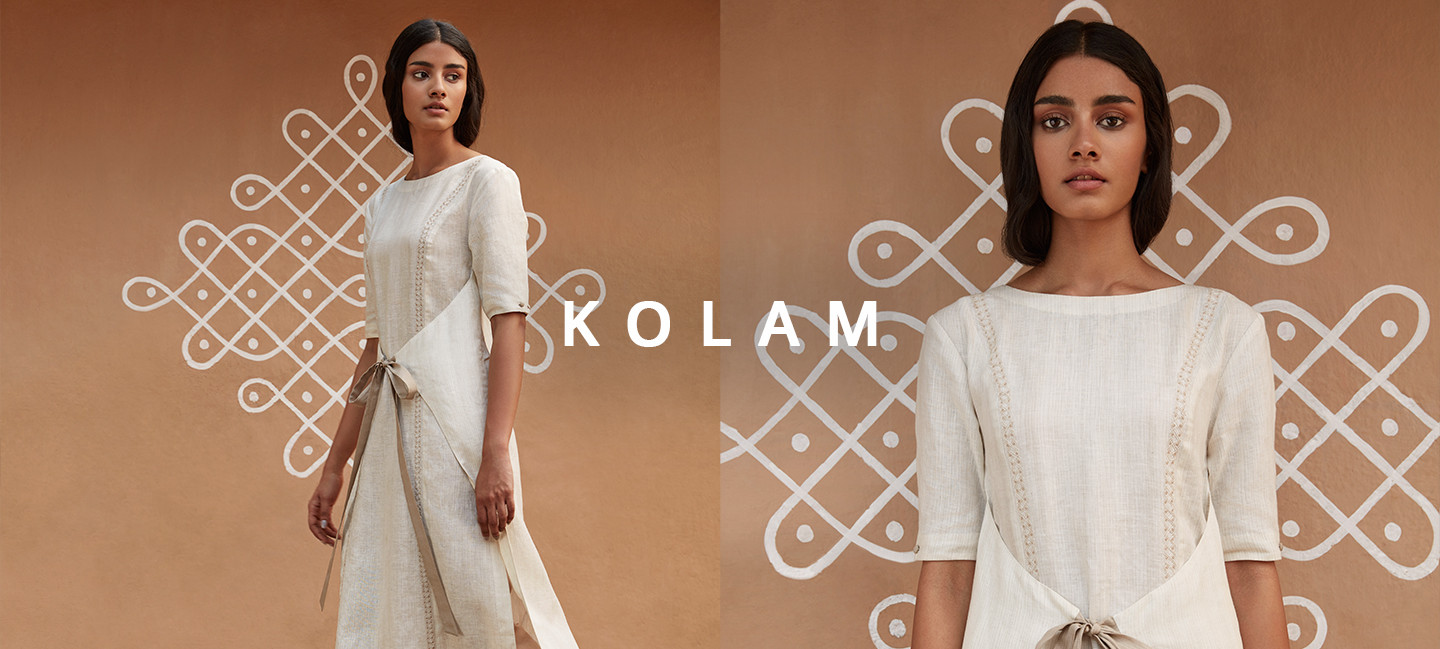 Ancestry’s Kolam takes its cue from a beloved Indian tradition that a finds place in our homes and hearts on festive occasions Natural motifs and geometric patterns in neutral tones of brown and olive make this a go-to workwear collection.A fluid and compelling collection, Kolam retraces ancient patterns in modern shades and silhouettes.