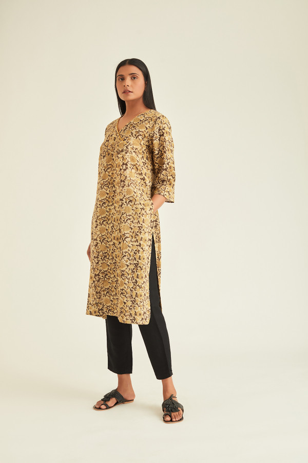 A wardrobe basic, the basic ajrak kurta is great for work plus it is classy & stylish. It is made out of the ajrak fabric with a wrap yoke & kantha work detailing. This style is a part of our Ajrak collection featuring contemporary silhouettes that bring the centuries old craft to the modern wardrobe.