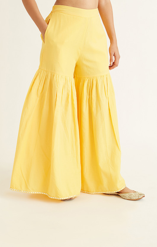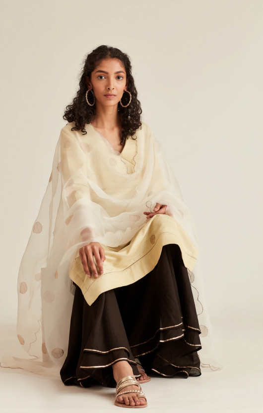 At Ancestry, you can buy skorts in classic white and black colour, decked with golden work at the hem. These pieces can be worn both as a sharara and a skirt. So whether you pair it with a long kurta or cropped top, you have the perfect outfit for a festive evening!