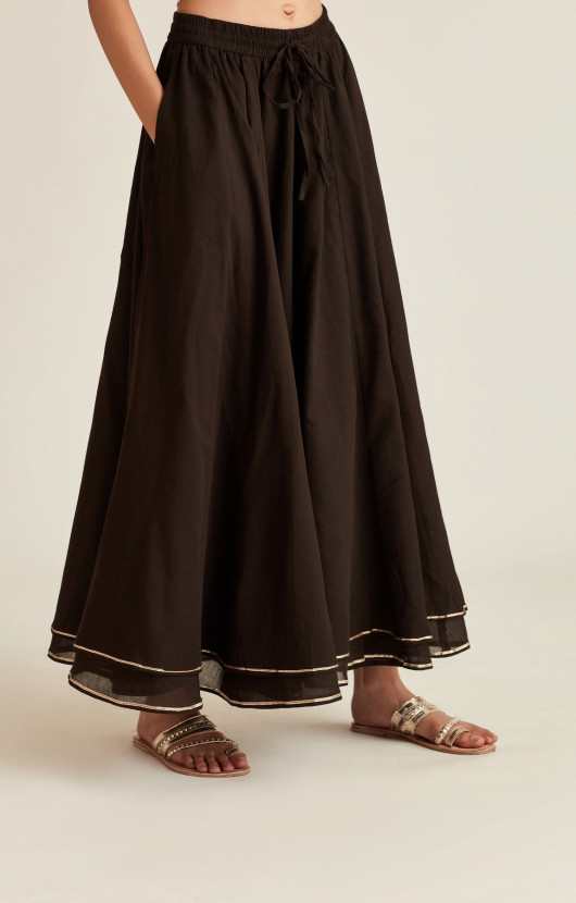 For instance, our maroon flared skirt in Chanderi fabric comes with a minimal gold border which gives it a subtle appeal. Best paired with high heels and a crop top, it is perfect for your next festive evening.
