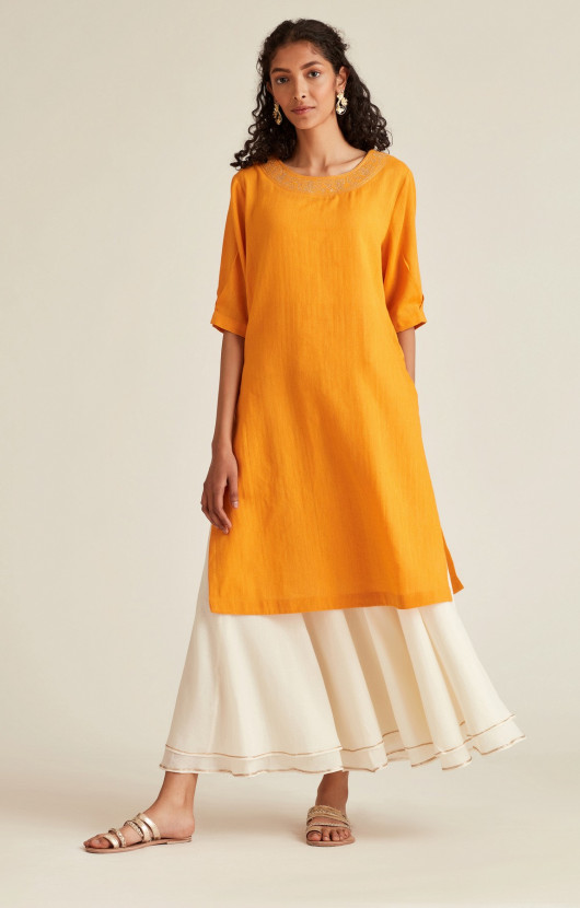 And if you're feeling a little experimental, try out our bright gold embroidered skirt in blue and style it with a matching blue kurta for a monochrome look. Throw in a statement belt, a pair of dangle earrings, and golden heels to complete the ensemble.