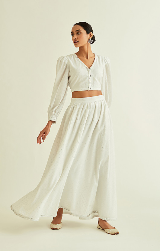 And if you're looking for something to wear to your friend’s wedding ceremony, our silver-white skirt is a must-have for you. Adorned with edge detailing and mirror work, it will look best with a shimmery white blouse, jhumkas, and a pair of embellished juttis.