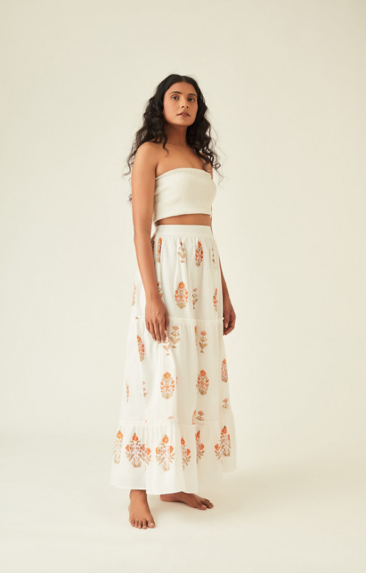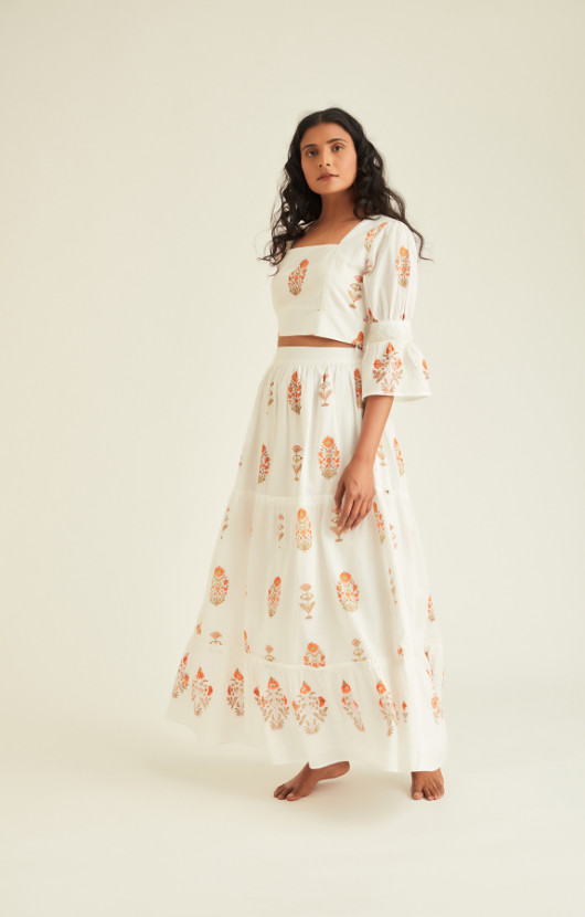 Welcome the summer festivities and fun outings with a stunning designer skirt in white. For instance, sport our beautiful phool jhaal skirt crafted with vibrant block prints with an orange crop top for a boho look. Our Souriant check skirt will work wonders as the cool and relaxed vacation wear when styled with a crop top and a pair of sneakers.